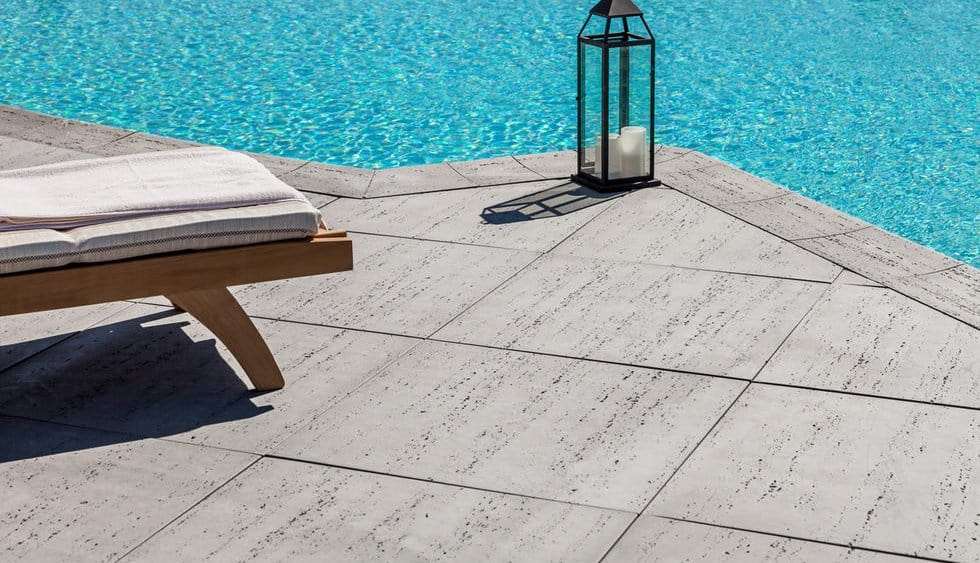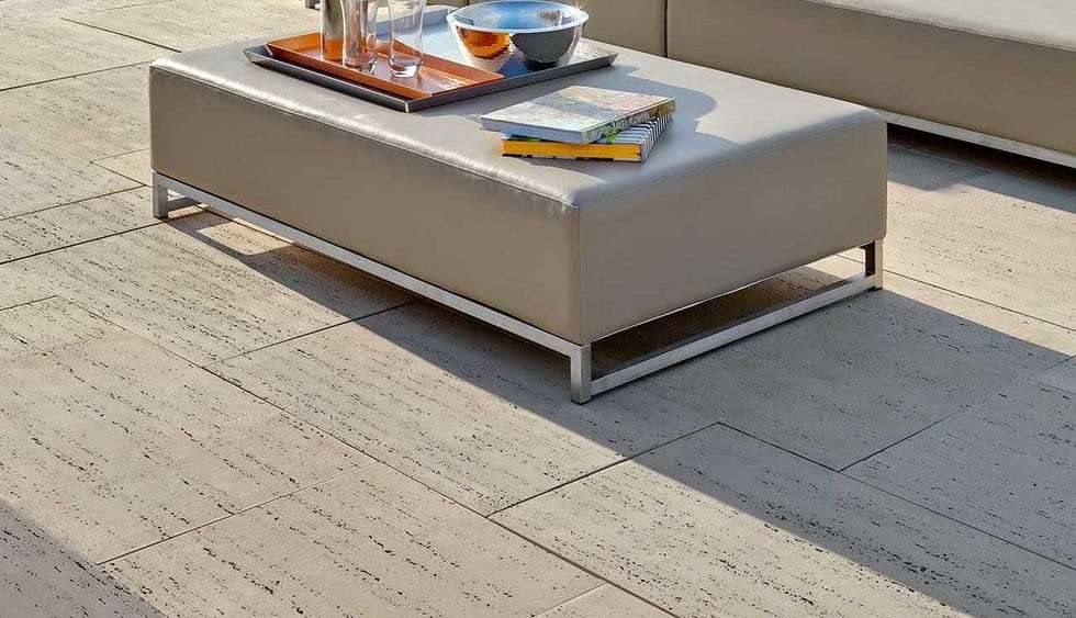 La dalle Travertina Brut en béton imite le fini du travertin naturel. Ainsi ce produit connaît un énorme succès grâce à un mélange de béton ultrarobuste, qui rend le matériau bien plus durable que le travertin naturel.